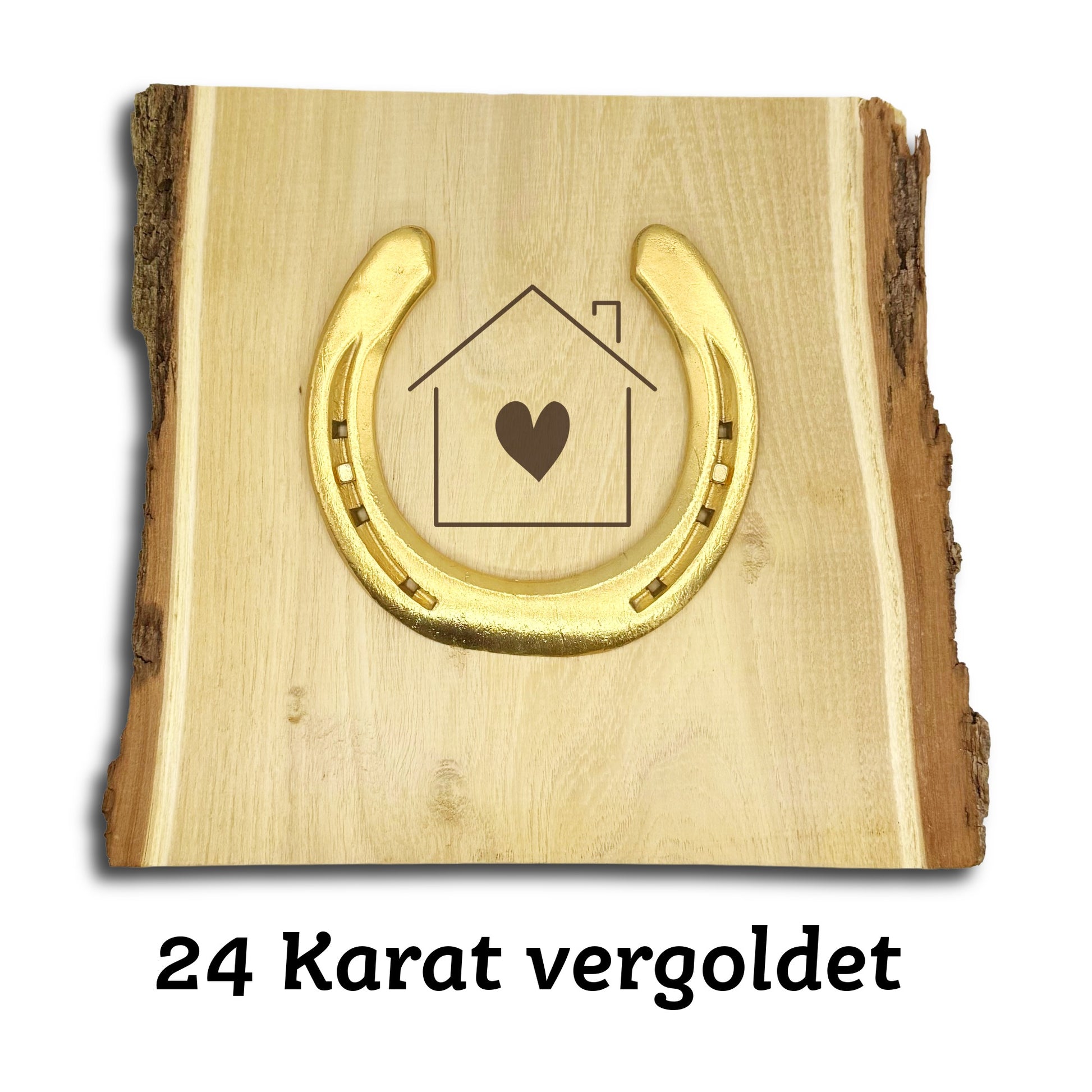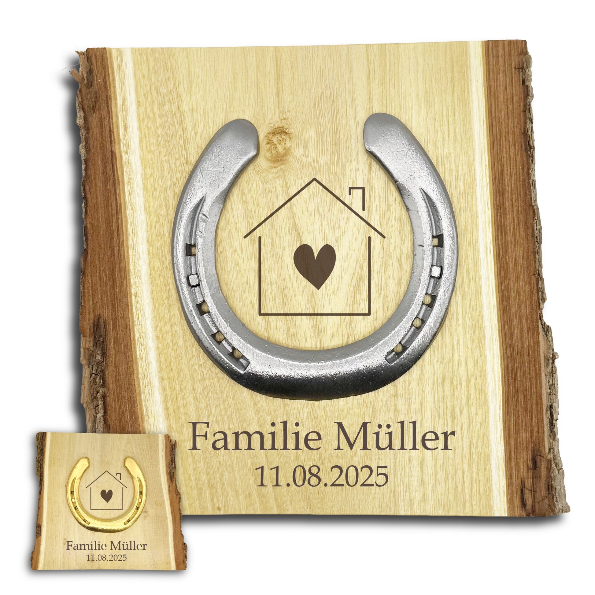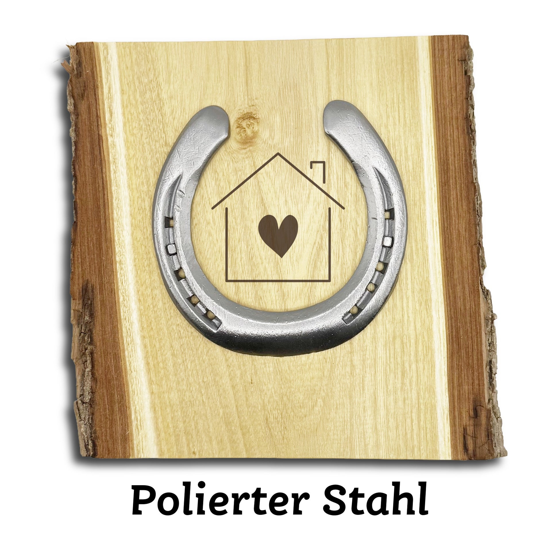 Im Inneren des Hufeisens ist eine feste Gravur eines Hauses mit Herzsymbol eingearbeitet – ein Zeichen für Liebe, Geborgenheit und Familie.