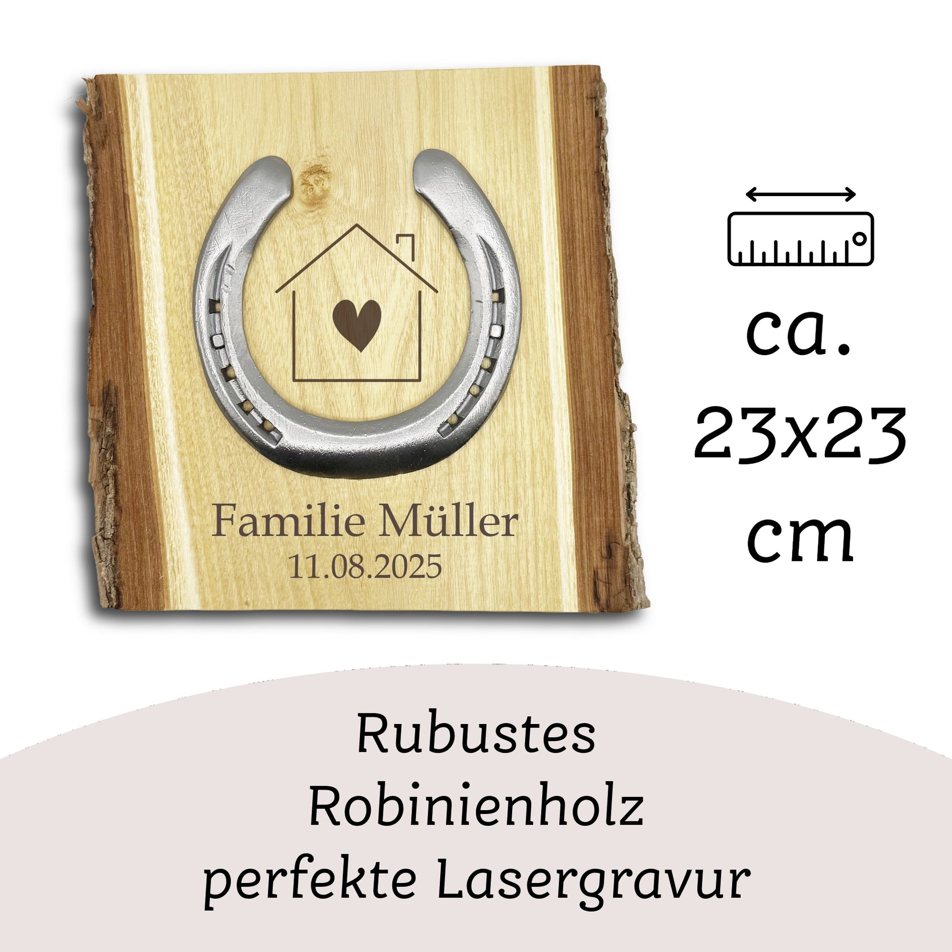 Unterhalb des Hufeisens wird die personalisierte Gravur mit dem Familiennamen und dem Datum der Einweihung angebracht, beispielsweise „Familie Müller – 11.08.2025“.