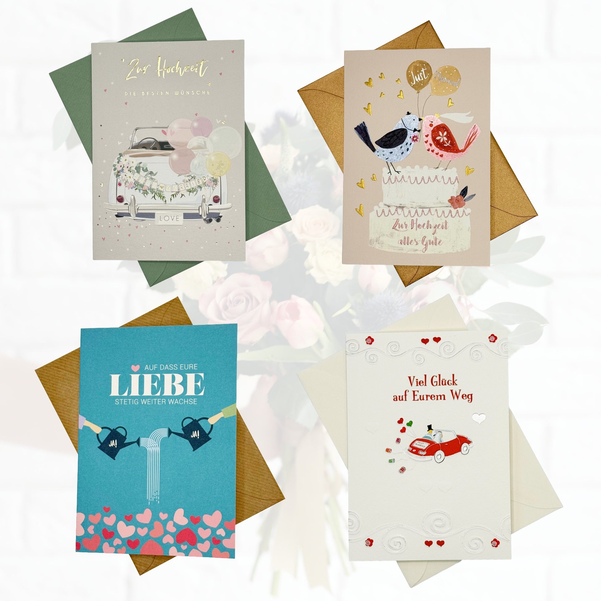 Unsere Hochzeitskarten aus hochwertigem Kartonpapier sind die perfekte Ergänzung zu einem Geschenk für das Brautpaar. Jedes der acht stilvollen Motive wurde mit viel Liebe zum Detail gestaltet – von romantisch bis modern – und wird mit einem farblich abgestimmten Umschlag geliefert.